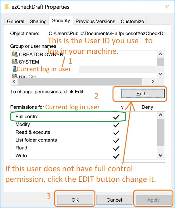 When you share the folder and database file on the server, please give FULL CONTROL permission (or at least Read, Write and Execute Permissions) to ezCheckDraft users.
