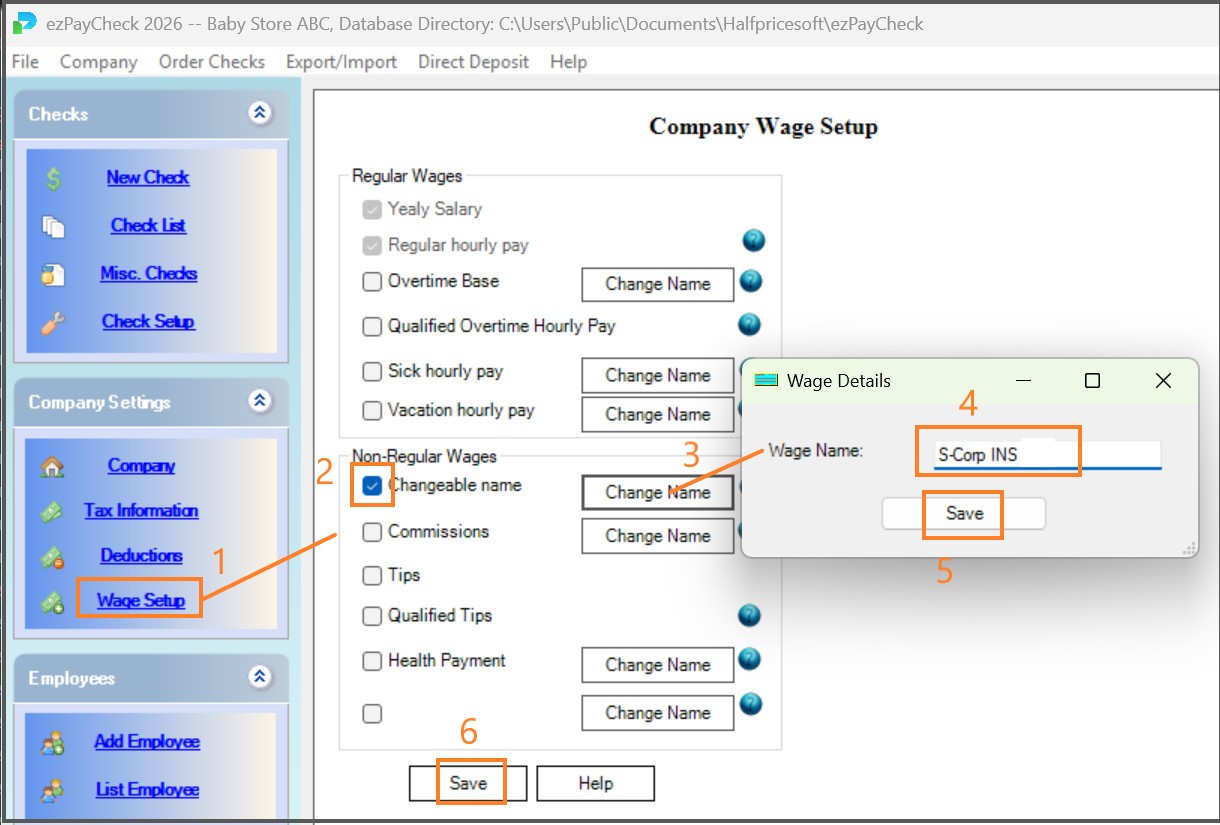 1.1. Start ezPaycheck, click the left menu "Company Settings->Wage Setup" to open the company Payment Setup screen.