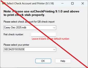 Important Note: Once this bypass is active, Virtual Printer will no longer ask you to select an account when you print. If you need to switch to a different bank account, you must open ezCheckPrinting directly and select the account manually before printing from your other software.