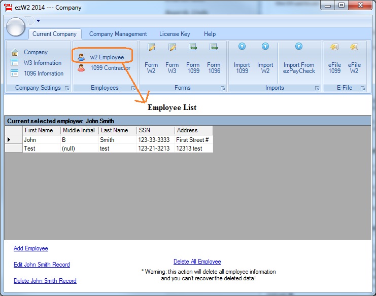 You can access employee list by clicking the top menu �Current Company->W2 Employee list�. You can add a new employee or edit or delete an existing one easily.