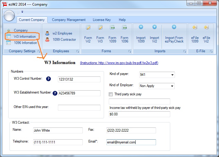 You need to enter the W-3 control number, W3 Establishment Number, Contact Information and others. This information will be displayed on both forms W-2 and W-3.